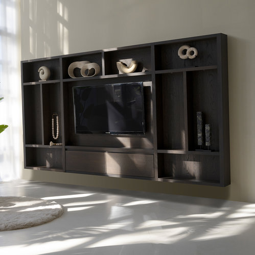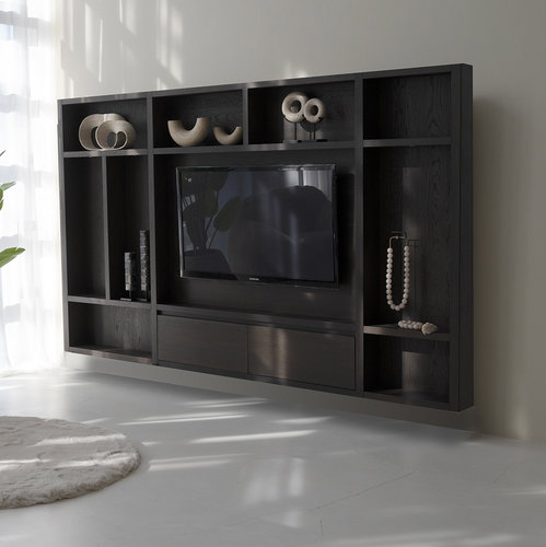 Cinewall Andrew Queen-size (280-320 cm) heeft een verfijnd samenspel tussen open vakken en gesloten deuren. Door deze combinatie zorgt dit model voor een perfecte mix tussen de moderne, strakke look met praktische opbergruimte. De cinewall wordt gemaakt van ons eiken materiaal wat bijdraagt aan de luxe uitstraling, welke vervolgens wordt afwerkt in de juiste kleur, zo komt dit model binnen ieder interieur uitstekend tot zijn recht. Luxe Cinewall Op MaatAltijd al gedroomd van jouw eigen thuisbioscoop? Maak je droom werkelijkheid met een cinewall van PUUUR. In de open vakken is ruimte voor je favoriete accessoires en achter de deuren is genoeg ruimte om spullen op te bergen.Elke cinewall bevat een cinepaneel in het midden van 200 cm, aangevuld met 2 vakkenkasten deze samen maken de cinewall compleet. De cinewalls zijn in verschillende maten beschikbaar. Kies de afmeting welke het beste past binnen jouw interieur en ontwerp je droommeubel op maat. In onze cinewalls passen tv's van 55 t/m 85 inch. Zit jouw gewenste ontwerp of afmeting er niet tussen? Neem dan contact op met onze klantenservice. Onze cinewalls zijn verkrijgbaar in de volgende maten: - Queen-size (280-340 cm) - King-size (350-410 cm) - Royal-size (420-480 cm) - Superior-size (490-550 cm) Doordat wij de productie volledig in eigen beheer hebben, kunnen wij een korte productietijd garanderen en dus een snelle levering. KleurstalenWij begrijpen dat je de kleur van het meubel graag in je eigen interieur wilt bekijken. Daarom is het hier mogelijk om onze kleurstalen te bestellen. Cinewalls met haardEen cinewall op maat kan perfect worden gecombineerd met een elektrische haard. Een elektrische haard is een ideale uitkomst wanneer jij geen rookkanaal of gasaansluiting beschikbaar hebt in de woning. Daarnaast geven deze een gezellige sfeer aan je interieur en bevatten diverse haarden ook een verwarmingssysteem, handig voor de koudere dagen! Montage en kabeldoorvoerEen Cinewall is een meubel waarin zowel een televisie, soundbar, elektrische inbouwhaard en verlichting gemonteerd kunnen worden. Bij het bestellen van een cinewall op maat moet er daarom rekening gehouden worden met montage en kabeldoorvoer. - Het is belangrijk dat er minimaal één stroompunt of stopcontact bij de Cinewall aanwezig is.- Houd er rekening mee dat alle bekabeling m.b.t. TV / Soundbar / TV kastje zoals HDMI of stroomkabels vooraf aanwezig zijn.- Standaard houden wij rekening met een kabeldoorvoer in het midden van de achterwand. Deze wordt via een kanaal begeleid naar het onderste deel van de Cinewall. Indien dit in jouw woonsituatie anders is neem dan contact op met onze klantenservice. - Voor specifiek maatwerk plannen wij een inmeetafspraak in.- Na bestelling nemen wij binnen 10 werkdagen contact op om de leverdetails te bespreken. Let op: Wij monteren geen TV en-/of soundbars en sluiten geen elektronische apparaten aan anders dan de verlichting van de Cinewall en/ of elektrische inbouwhaard. Experience CenterOnze Cinewalls graag in het echt bekijken? Breng dan een bezoek aan ons Experience Center in Purmerend. Hier zijn diverse ingerichte ruimtes te zien en staat er altijd iemand voor je klaar met een passend advies. Klik hier voor meer informatie over ons Experience Center. Ons complete assortimentNaast Cinewalls hebben wij ook andere meubelen in onze collectie. Zo hebben wij ook bijvoorbeeld vakkenkasten, salontafels en tv-meubelen. Deze zijn ook geheel naar wens zelf samen te stellen. Combineer meerdere soorten meubels uit dezelfde serie en creëer een mooi geheel.