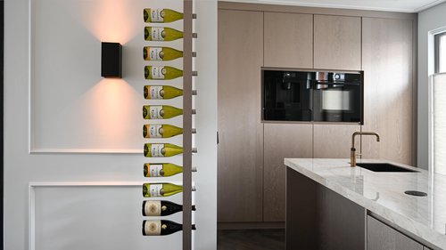Dit strakke design presenteert je mooiste flessen champagne boven elkaar op een stijlvolle, maar functionele manier tussen je vloer en plafond. De flessen kunnen in beide kanten van de paal getoond worden. De wijnpaal wordt zonder probleem op de gewenste hoogte gezaagd zodat deze op iedere plek in het huis geplaatst kan worden.